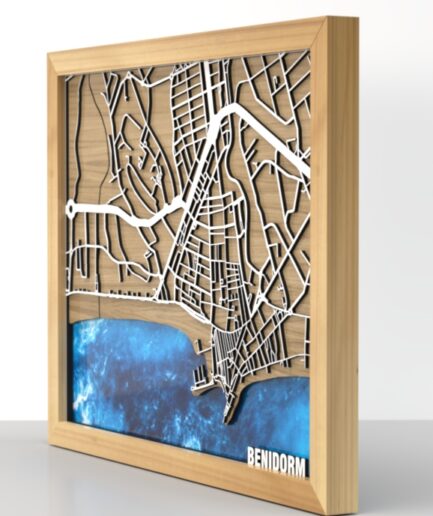 Todos nuestros mapas están fabricados en madera de pino natural de moldura 25 x 20 mm. Mecanizados con corte en inglete con agujero en el marco para colgar, con acabado tintado y con grapas removibles que sujetan las tres planchas.